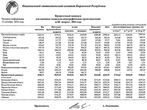 Также Нацстатком приводит данные о прожиточном минимуме, который полагается каждому кыргызстанцу и разделен по социально-демографическим группам: средний прожиточный минимум на душу населения, прожиточный минимум для трудоспособных граждан (для мужчин и женщин), минимум для пенсионеров и детей. В него входят как продовольственные товары, так и непродовольственные, услуги и налоги.