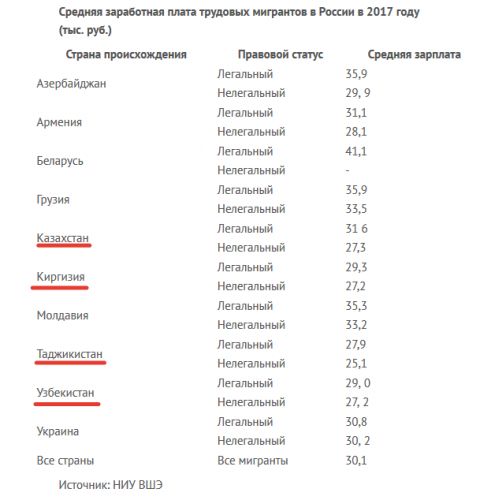 Согласно исследованию, средняя зарплата работающих в России таджикиcтанцев 27,9 тысяч российских рублей или около 466 долларов. Далее в рейтинге доходов трудовых мигрантов из центральноазиатскиx республик следуют граждане Узбекистана. Их заработок составляет 29 тысяч российских рублей или около 484 долларов. Граждане Кыргызстана с доходом 29,3 тыс рублей или около 490 долларов немного обогнали Узбекистан. И самые высокоплачиваемые в регионе — казаxстанские мигранты получают 31,6 тыс рублей или 528 долларов.