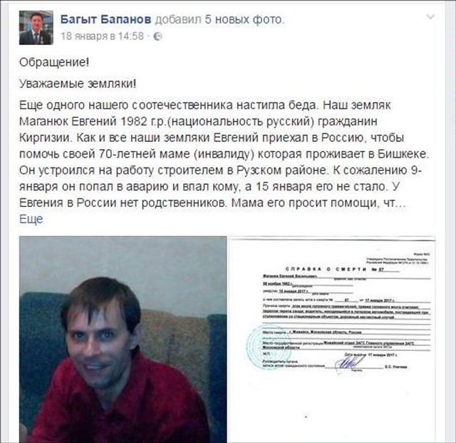 «Еще одного нашего соотечественника настигла беда. Наш земляк Маганюк Евгений 1982 г.р. (национальность – русский), гражданин Киргизии. Как и все наши земляки, Евгений приехал в Россию, чтобы помочь своей 70-летней маме (инвалиду), которая проживает в Бишкеке. Он устроился на работу строителем в Рузском районе. К сожалению, 9 января он попал в аварию и впал кому, а 15 января его не стало. У Евгения в России нет родственников. Мама его просит помощи, чтобы тело отправили в Киргизию. Он был единственным сыном в семье. Чтобы отправить его тело в Бишкек, не хватает 38 тысяч рублей. Обращаюсь ко всем, кому небезразлична судьба нашего соотечественника, помочь, кто сколько может. Собранные средства пойдут на отправку тела. Свидетельство о смерти Евгения имеется».