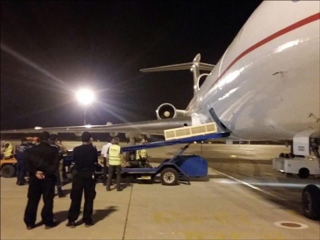 Из прибывшего из Москвы самолета выгружают гробы с телами женщин, погибших при пожаре в типографии. Фото © «Вечерний Бишкек»