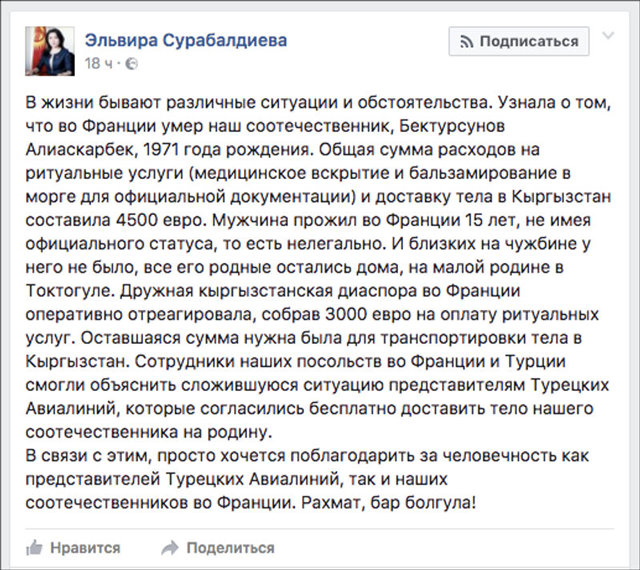 Решить проблему доставки «груза 200» из дальнего зарубежья еще дороже и сложнее. Но и здесь на помощь приходят соотечественники – представители киргизских общин. На днях, 24 января, об одном таком случае в своем посте сообщила пользователь Facebook Эльвира Сурабалдиева: «Узнала о том, что во Франции умер наш соотечественник Бектурсунов Алиаскарбек, 1971 года рождения. Общая сумма расходов на ритуальные услуги (медицинское вскрытие и бальзамирование в морге для официальной документации) и доставку тела в Кыргызстан составила 4500 евро. Мужчина прожил во Франции 15 лет, не имея официального статуса, то есть нелегально. И близких на чужбине у него не было, все его родные остались дома, на малой родине в Токтогуле. Дружная кыргызстанская диаспора во Франции оперативно отреагировала, собрав 3000 евро на оплату ритуальных услуг. Оставшаяся сумма нужна была для транспортировки тела в Кыргызстан. Сотрудники наших посольств во Франции и Турции смогли объяснить сложившуюся ситуацию представителям Турецких авиалиний, которые согласились бесплатно доставить тело нашего соотечественника на родину. В связи с этим просто хочется поблагодарить за человечность как представителей Турецких авиалиний, так и наших соотечественников во Франции. Рахмат, бар болгула!».