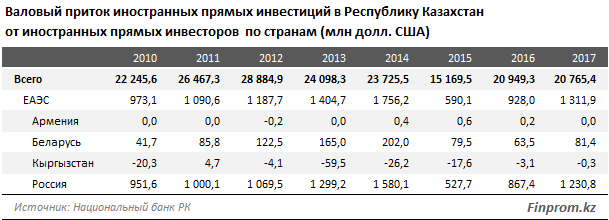 Валовый приток инвестиций в Казахстан из стран союза составил 1,3 млрд долларов. Ключевой инвестор — Российская федерация: 1,2 млрд долларов. при этом Россия два года наращивает объем вливаний в казахстанскую экономику. По масштабам инвестиций в 2017 году федерация заняла четвертое место среди стран — инвесторов в Казахстан. Такие данные приводит finprom.kz.