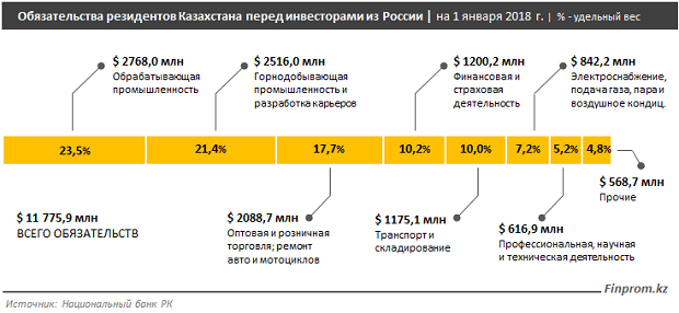 Исходя из геополитических и экономических условий, в рамках инвестиционной стратегии страны-члены ЕАЭС выделены в наиболее приоритетный блок по притоку прямых иностранных инвестиций. И в первую очередь речь о Российской Федерации. Общий объем обязательств Казахстана перед российскими инвесторами на конец 2017 года составил 11,8 млрд долларов. Из них 24% приходится на обрабатывающую промышленность, и 21% на — горнодобывающий сектор.