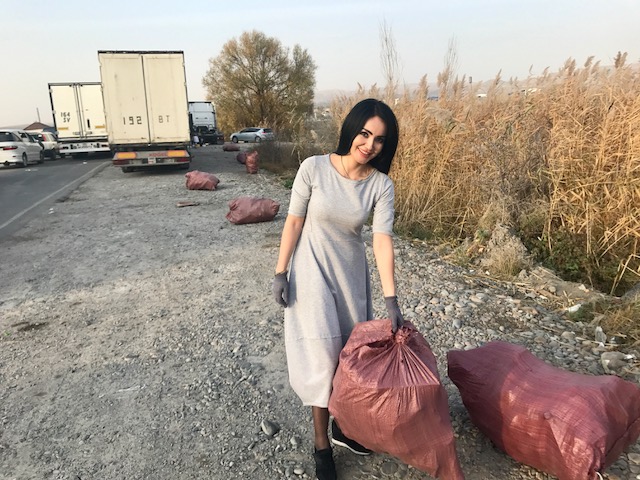 На фото: : Горячая осень 2017 года. Чуйская область. Кроме горячего питания и раздачи сухпайков водителям застрявших возле КПП «Ак-Тилек» большегрузов, волонтеры из казахской диаспоры организовали уборку вдоль трассы, собрав около тонны мусора. На фото активистка Карина Байлярова на очистке обочины шоссе, ведущей к границе двух стран…