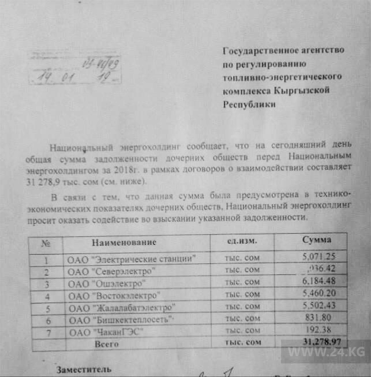 Согласно документу, «Электрические станции» задолжали холдингу 5 миллионов сомов, «Северэлектро» — 8 миллионов, «Ошэлектро» — 6,1 миллиона, «Востокэлектро» — 5,4 миллиона, «Джалал-Абадэлектро» — 5,5 миллиона, Бишкектеплосеть — 831,8 тысячи, «Чакан ГЭС» — 192,3 тысячи.