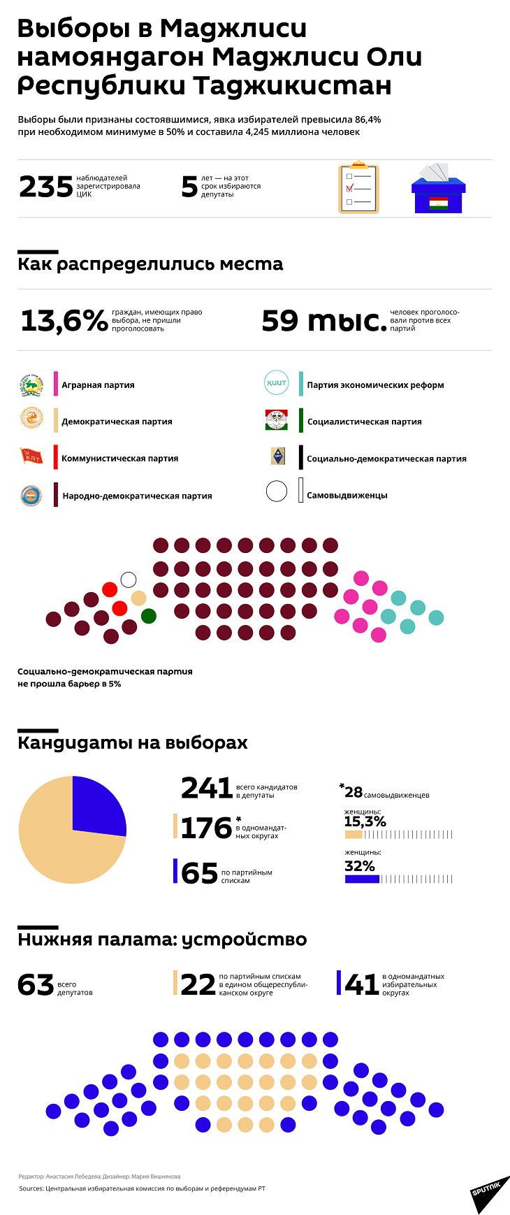 Таким образом, НДПТ получила большинство в нижней палате - 46 мест из 63. Следом за ней Аграрная партия с 7 местами. Третья - Партия экономических реформ, ей досталось 5 мест. У коммунистов 2 места, а у демократов и социалистов - по одному. Еще одно у самовыдвиженца. Социал-демократическая партия Таджикистана вообще не прошла в парламент.