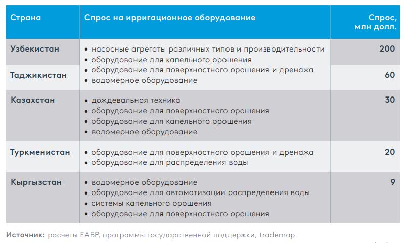 ЕАБР и ЮНИДО предлагают развивать местное производство ирригационного оборудования, что поможет сократить потери воды и снизить зависимость от импорта. Они анализируют проблемы нехватки воды, старение ирригационной инфраструктуры и последствия изменения климата.