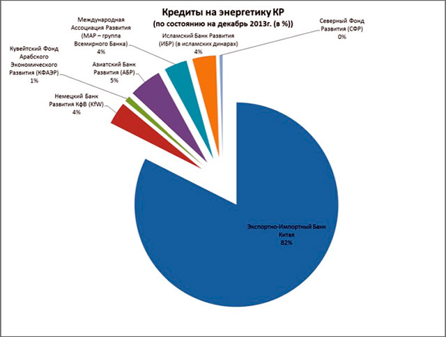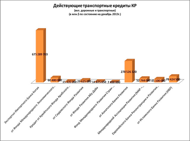 На декабрь 2013 года у Кыргызстана - 151 действующий кредит. Самые серьезные приходятся на энергетику и транспорт: 24 и 25,5 процентов соответственно от всех действующих соглашений. Больше всего страна должна импортно-экспортному банку Китая: 984 млн долларов на энергетику и более 675 млн долларов - транспорт.