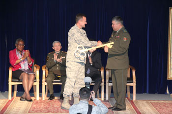Церемония закрытия ЦТП увенчалась передачей символического огромного ключа от базы первому заместителю командующего Национальной гвардией Кыргызстана полковнику Мирбеку Имаеву. Отныне на этой огромной территории командуют кыргызские нацгвардейцы. Как сообщил журналистам первый заместитель министра обороны полковник Замир Суеркулов, теперь они с оставшимися американскими военнослужащими будут совместно патрулировать территорию базы.