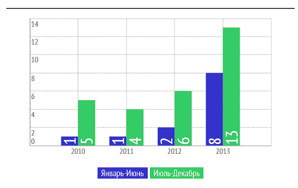 При анализе обращений мы заметили любопытную закономерность. В период с 2010 по 2014 годы количество обращений, разосланных «Советом правозащитников Кыргызстана» во второй половине года, значительно превышало показатели с января по июнь. При этом наибольшее количество обращений правозащитники распространяли ближе к концу года - в ноябре и декабре месяце.