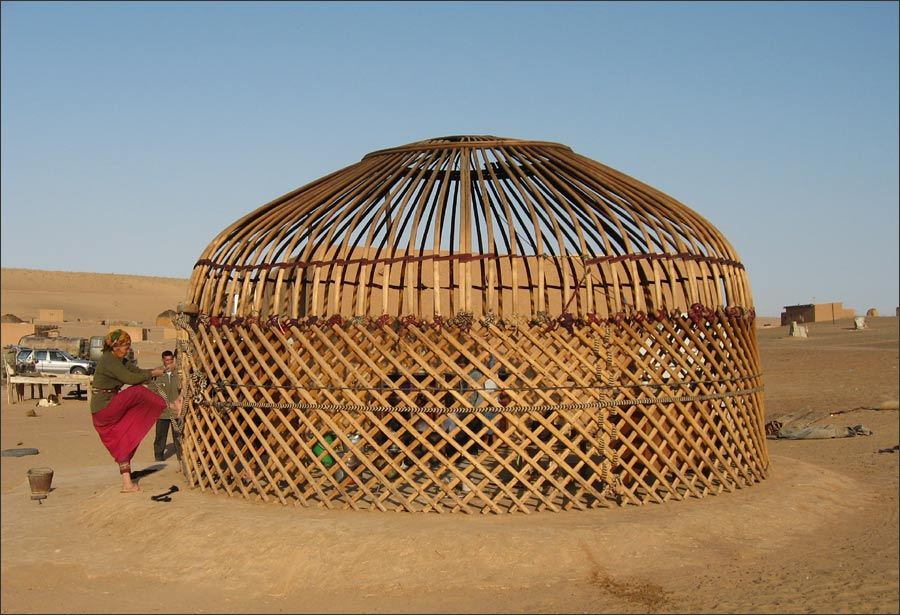Как отмечается, юрта представляет из себя цилиндр диаметром 4 метра, собранный из пластин фанеры, которые крепятся друг к другу веревками и стягиваются ремнями по окружности.