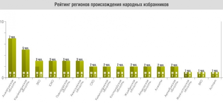 Статистика говорит о том, что из 47 членов «верхней» палаты парламента, состав которой пополнился 1 октября 2014 года, наибольшее количество депутатов породили Алматинская и Карагандинская и области. За ними следуют Акмолинская, Южно-Казахстанская, Западно-Казахстанская и Павлодарская области. Наименее плодовитыми оказались Восточно-Казахстанская, Мангистауская области и Астана.