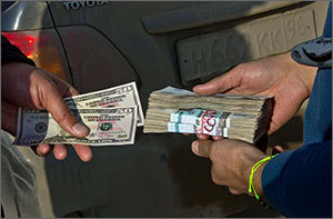 «Доллар у нас скачет не по дням, а по часам, за три недели он подорожал практически на 500 сумов, - сообщил «Фергане.Ру» один из ташкентских читателей. - Если в середине января за доллар давали 3500 сумов, то уже сегодня за него дают от 3900 до 4050 сумов. И это не предел. Российский рубль, напротив, упал. Если летом за один рубль давали 80 сумов, то сейчас он стоит 50 сумов. Все валютные операции проводятся исключительно на «черном рынке», потому что, как известно, с января 2013 года продажа наличной валюты в обменных пунктах запрещена. Однако возле каждого обменного пункта, а также на базарах в открытую стоят валютчики - обычно крепкие и хамоватые мужчины и женщины, с черными целлофановыми пакетами в руках, в которых отчетливо просматриваются кипы узбекских сумов. Милиционеры, охраняющие обменные пункты, внешне равнодушно наблюдают за деятельностью валютчиков. В отсутствие клиентов валютчики мирно беседуют с милиционерами. Иногда видишь, когда здесь же покупает валюту человек в погонах и военной форме. Все это наводит на мысли, что «черный рынок» валюты находится под очень хорошей, крепкой крышей».