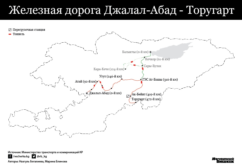 "Участок железной дороги от угольного карьера Кара-Кече идет от станции Кочкор (61-й км) и выходит на станции Сары-Булак. На участке дороги Кочкор - Кара-Кече около перевала Кызарт предусмотрено строительство тоннеля длиной 4,2 км. Тоннель протяженностью 10 км предлагается построить на участке Кара-Кече - Сары-Булак. На участке Сары-Булак - Ат-Башы около перевала Долон также планируется строительство тоннеля протяженностью 15 км", - говорится в сообщении.