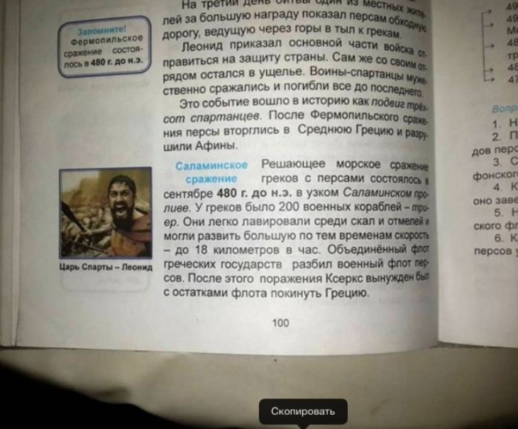 Создатели учебника поместили фото актера в разделе, рассказывающем о Саламинском сражении. В нем греческие войска возглавлял царь Леонид. Вместо реального облика царя, воссозданного по древним картинам и скульптурам, в учебнике оказалась фотография Батлера из кинофильма.