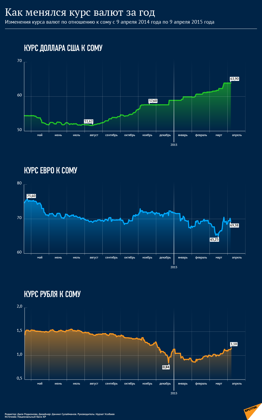 В декабре 2014 года стоимость российской валюты упала до отметки 0,84 сома из-за введения второго пакета санкций в отношении РФ со стороны США и Европейского союза. Но в течение трех месяцев валюта России продемонстрировала свой рост. Учетный курс рубля, установленный Национальным банком Кыргызстана, в четверг составляет 1,2 сома. В обменных пунктах российскую валюту продают по 1,21 сома, а покупают по 1,23 сома.