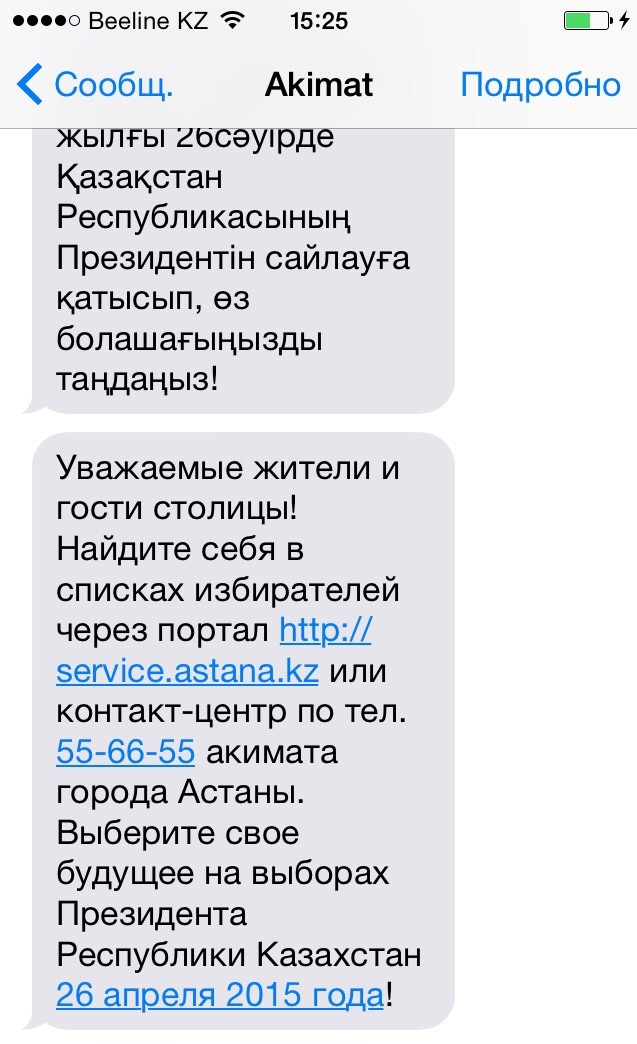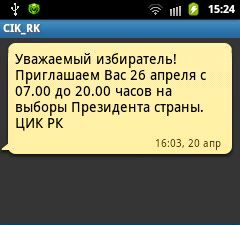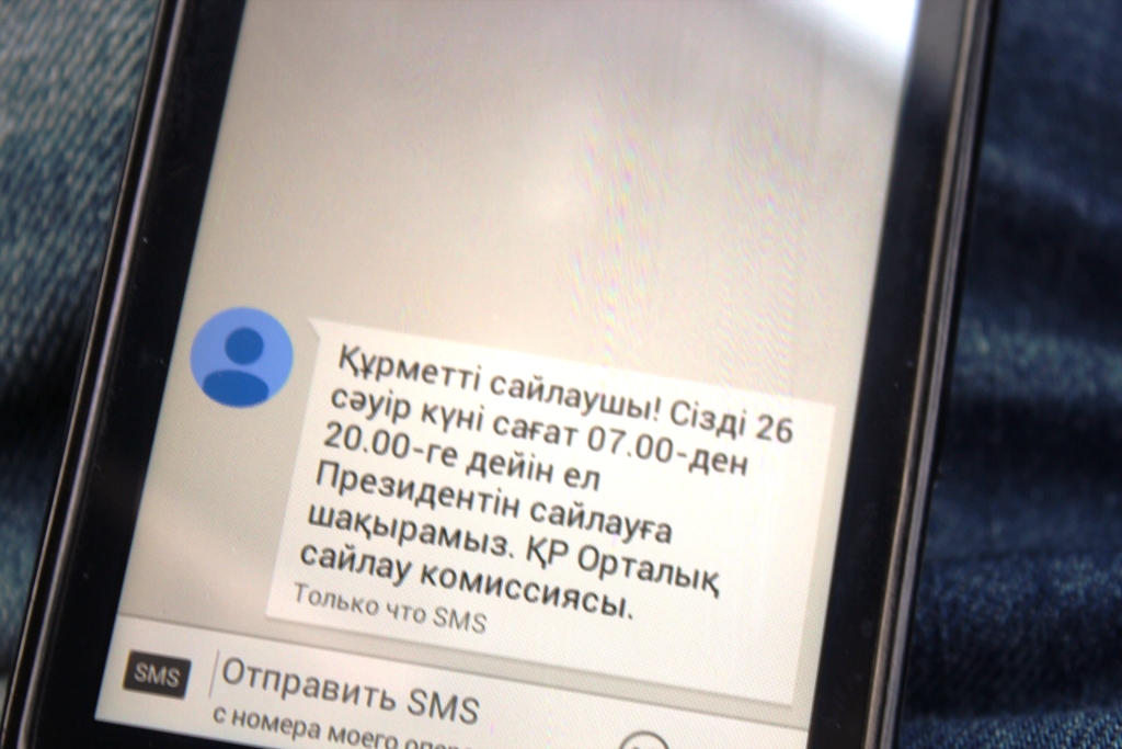 Центральная избирательная комиссия РК рассылает в эти дни SMS-сообщения. Это тоже своего рода новшество, раньше от государственных органов казахстанцы получали лишь рассылку от службы ЧС о морозах или усилении ветра.