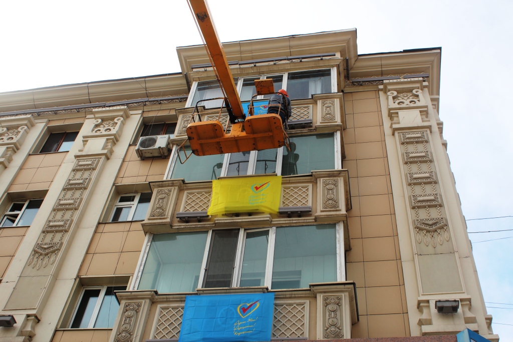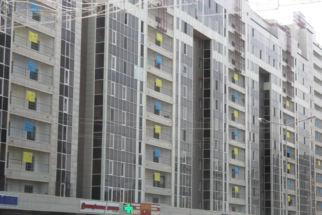 Сегодня, например, дома на центральных улицах Астаны частично "окрасились" в желто-синие цвета.