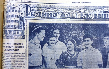 Фото 2. Выпуск 1941 года. «Огненный выпуск» - так называют выпускников школ 1941 года. На снимке, опубликованном в газете «Коммунист Таджикистана» от 21 июня 1941 года, счастливые выпускники средней школы № 1: Ходжаев Гафур решил поступать в Московский университет, Николаева Галя - в театральное училище, Бабанова Антонина - в мединститут, Ильябаев Илья - в артиллерийское военное училище, Полтиэлов Авнер - в летное училище. " А завтра была война..."