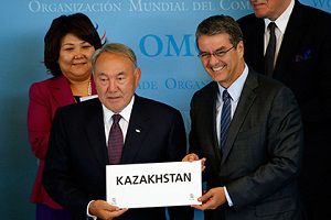 Президент Казахстана Нурсултан Назарбаев и гендиректор ВТО Роберту Азеведу подписали в Женеве протокол о присоединении центральноазиатского государства к организации, сообщает ТАСС. Переговоры о вступлении велись почти 20 лет и завершились 10 июня.