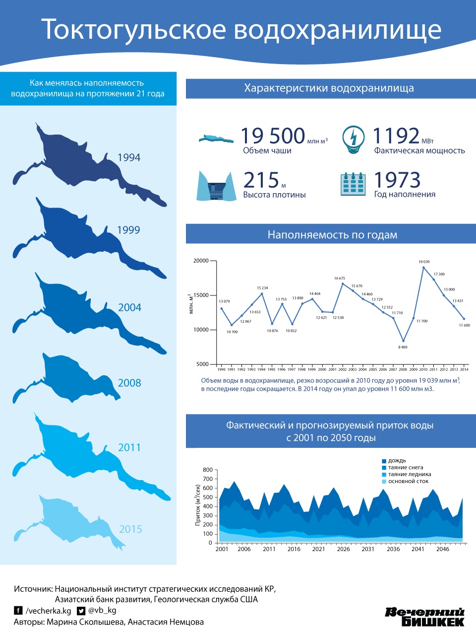 С приходом независимости ситуация поменялась. Для обеспечения внутреннего энергоснабжения власти начали увеличивать зимние попуски воды. Впрочем, несмотря на свои колоссальные масштабы, на 100% обеспечить республику электроэнергией Токтогулка не в состоянии. В отдельные годы климатические шоки приводили к тому, что резервуар заполнялся лишь чуть больше, чем наполовину. А в 2008 году объем воды почти достиг мертвого уровня, составляющего кубокилометров.