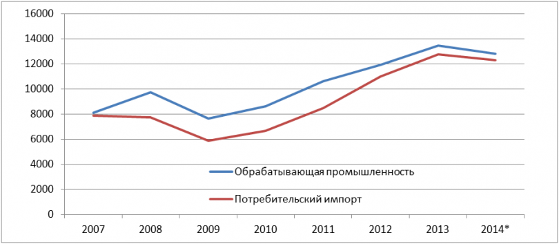 Объёмы потребительского импорта и производство обрабатывающей промышленности