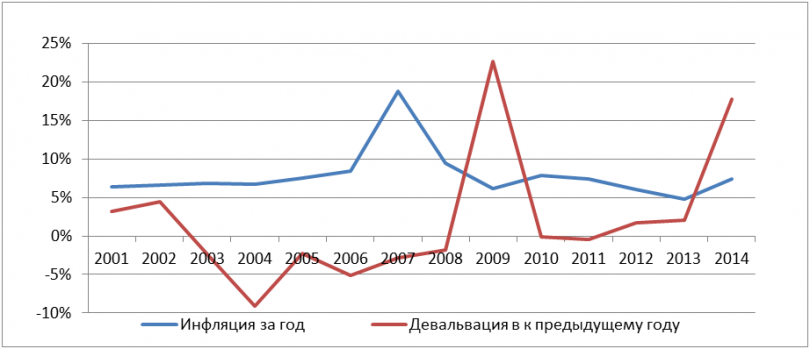 График инфляции и девальвации (номинальной "инфляции" тенге к доллару)