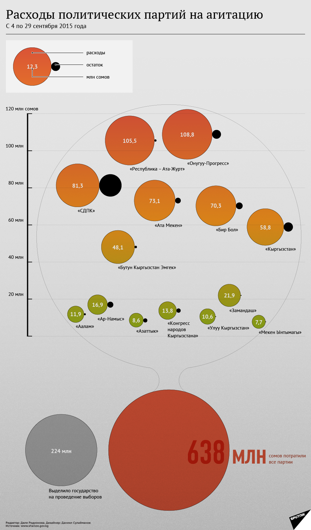 С начала агитационного периода — с 4 сентября по 29 сентября — политические партии Кыргызстана потратили на свои избирательные кампании 638 миллионов сомов.