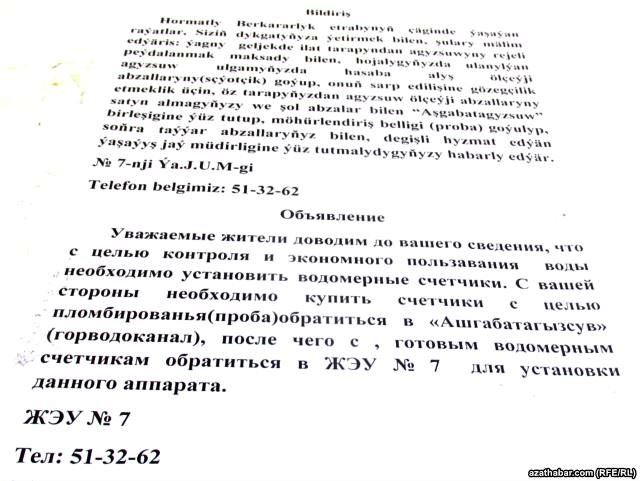 После того, как по требованию властей с фасадов и крыш многоэтажных домов в Ашхабаде были сняты спутниковые антенны и наружные блоки сплит-систем, у входа в подъезды этих домов работники жилищно-эксплуатационных управлений расклеили новые объявления.