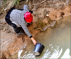 Вместе с ней спустилась и я - к воде вели глиняные ступеньки. В дождливую погоду очень легко поскользнуться и упасть вниз, но пока сухо. Женщина ведром помешала воду, чтобы в сторону отплыл мусор, зачерпнула и с трудом начала подниматься наверх. В день Саадат совершает по три-четыре таких похода за водой. Женщина подтвердила, что сельчане действительно пьют эту мутную грязную воду, готовят на ней еду и используют для других хозяйственных нужд. Только вряд ли даже отстаивание и кипячение делают ее пригодной к употреблению. Но другого выхода пока нет…