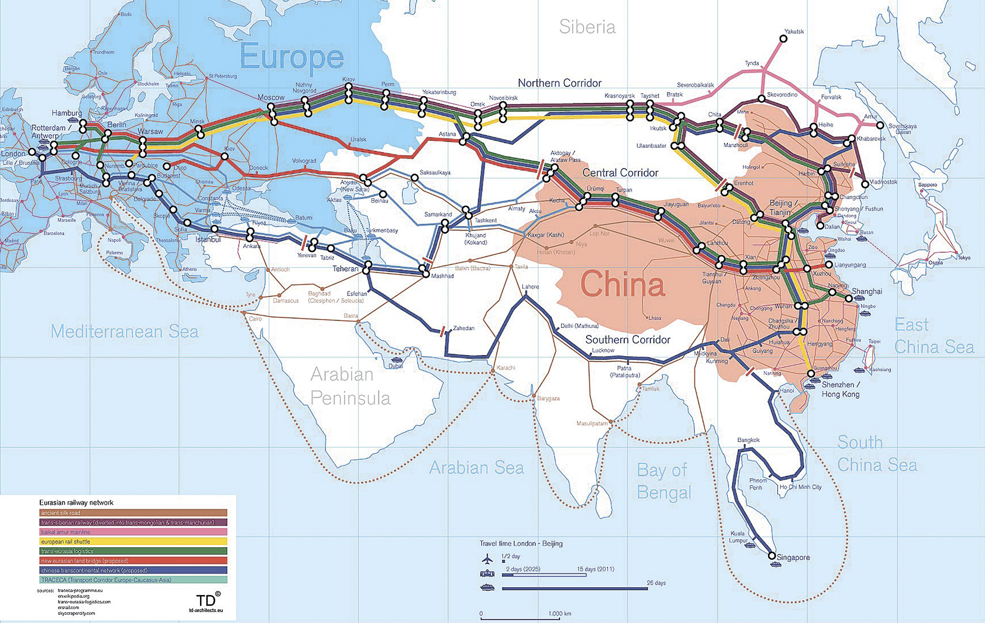 - усиление коммуникационных связей в Евразии, создание транспортного коридора от Тихого океана до Балтийского моря и создание транспортной сети, соединяющей Восточную, Западную и Южную Азию;