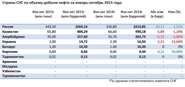 На первом месте по объему добычи нефти находится Российская Федерация. За январь-октябрь 2015 года в России было добыто 443,5 млн тонн или 3264,16 млн баррелей нефти, это больше чем за аналогичный период 2014 года на 6,7 млн тонн или на 49,3 млн баррелей. Если взять весь объем добычи нефти стран СНГ то на долю России приходится 80,96%. Также Россия единственная страна среди СНГ который смог значительно увеличить объем добычи нефти.