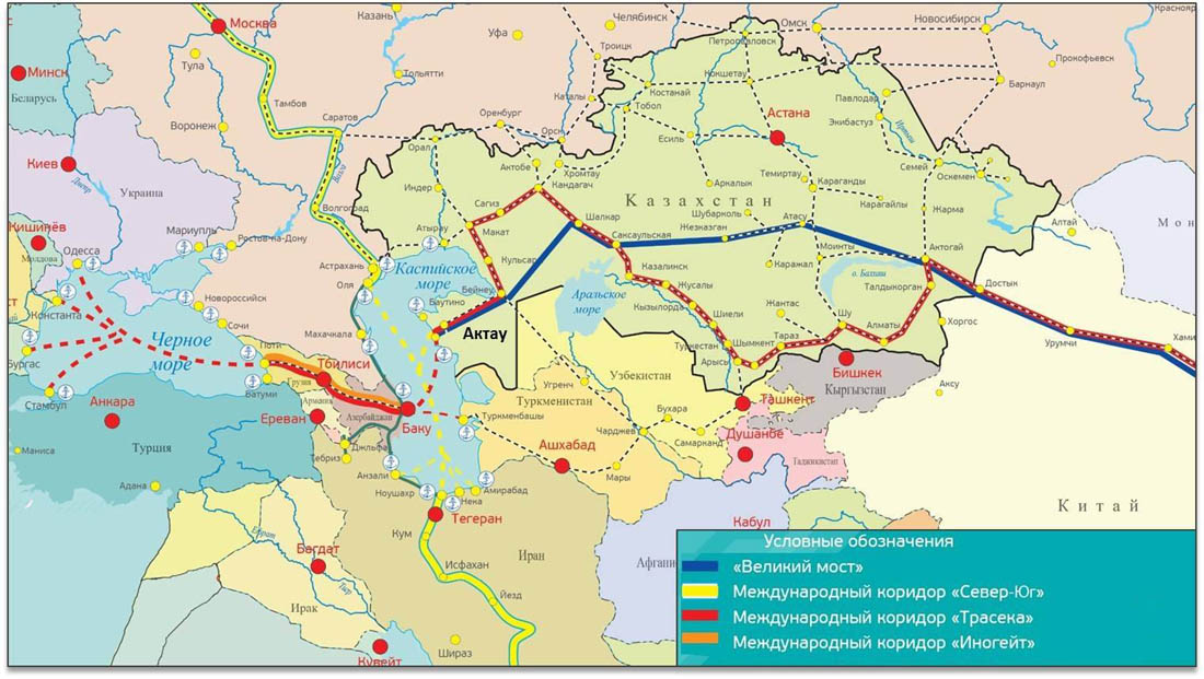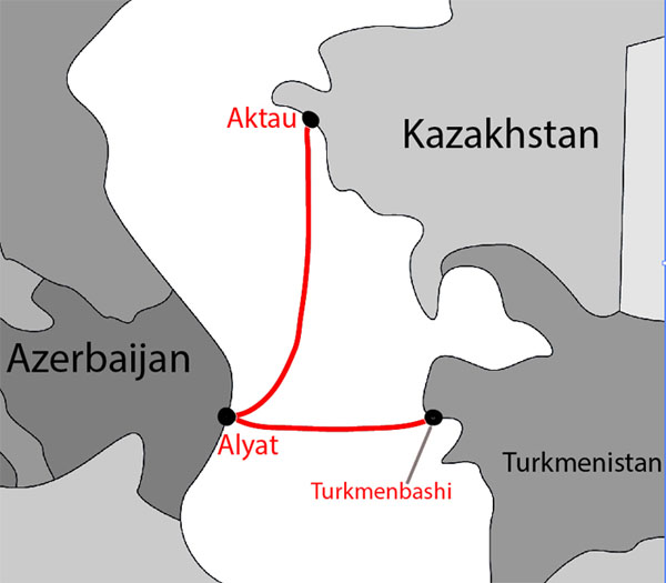 Во-вторых, для осуществления связи через Каспийское море задействована совершенно новая паромная переправа Казахстан - Азербайджан (Актау - Алят), взамен старой советской через Красноводск (ныне Туркменбаши), которая предполагалась по предыдущему мертворожденному проекту ТРАСЕКА. Почему? Потому что помогает избежать двух дополнительных стран на пути со своим таможенным режимом и специфическими правилами - Узбекистана и Туркмении.