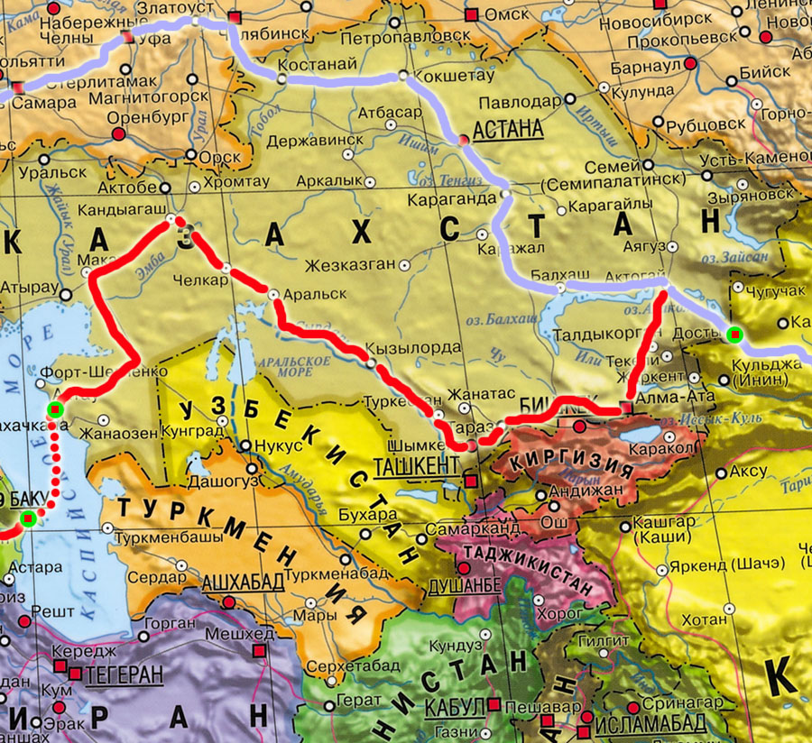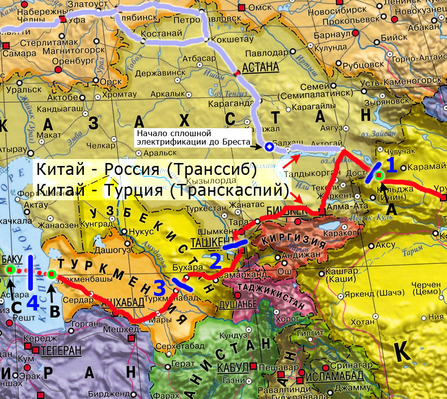 Светло-голубым показан классический казахстанско-транссибирский маршрут, на котором уже от ст. Моинты начинается электрифицированная двухпутка с единой весовой нормой состава, действительной и неизменяемой до самой границы ЕС в Бресте, без каких-либо перевалок на пути и доп. таможенных процедур.