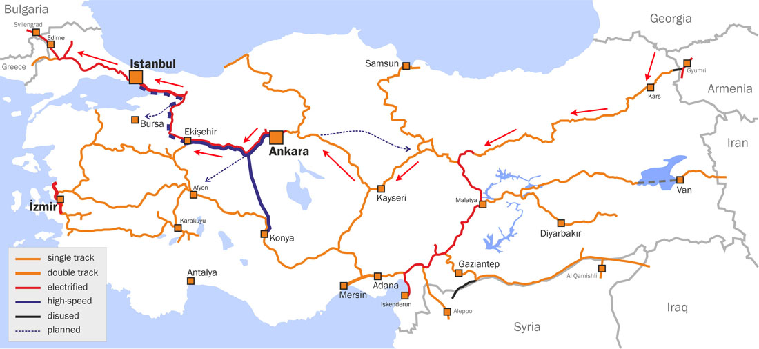 Пройдя тоннель Мармарай под Босфором, сданный не так давно (не будем сейчас о том, что он 17 часов в сутки пропускает стамбульские метропоезда), состав на границе с Болгарией упирается в запущенные балканские линии со слабой пропускной способностью. По главному транзитному коридору через Сербию (чтобы избежать ещё одного таможенного режима) такой поезд, скорей всего, не пустят - и идти ему через Румынию - Венгрию, "боком".
