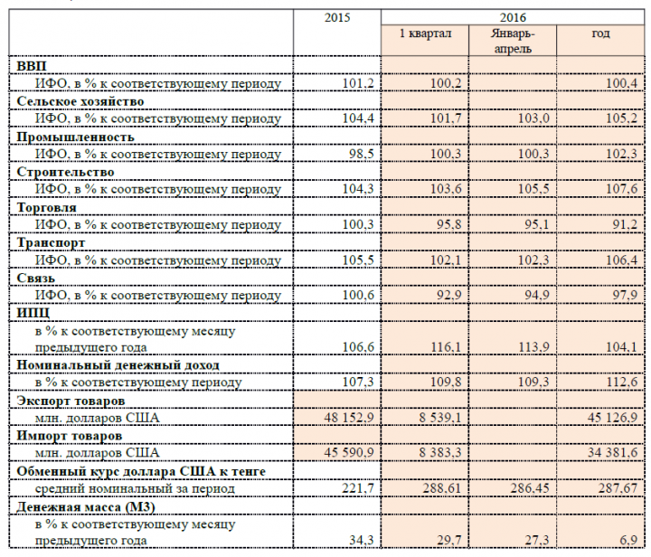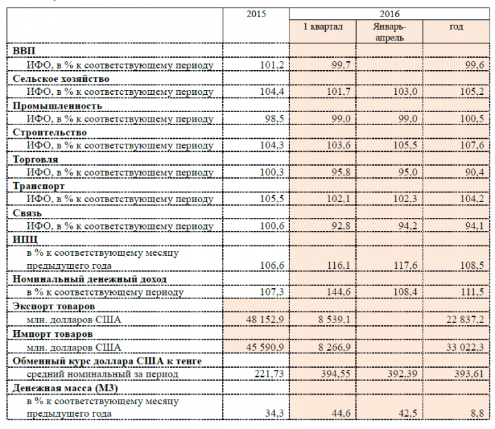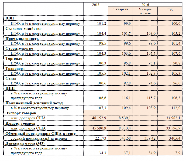 За январь-апрель 2016 года по сравнению с аналогичным периодом прошлого года ожидается рост в сельском хозяйстве (3%), промышленности (0,3%), строительстве (5,5%), транспорте (2,3%). Обменный курс доллара США составит 286,425 тенге, номинальные денежные доходы населения увеличатся на 9,3%, что не покрывает рост инфляции в 13,9%.