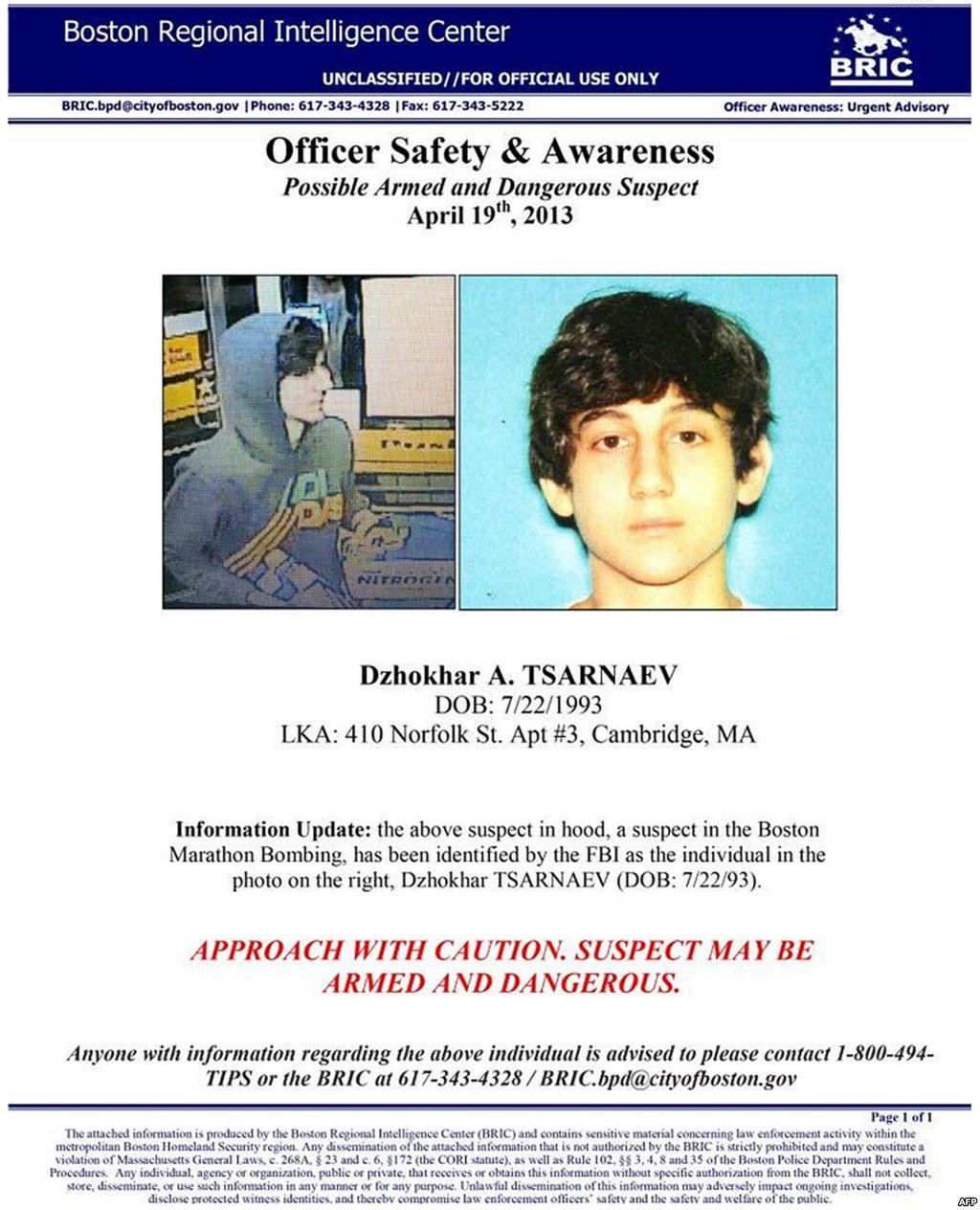 Объявление о розыске Джохара Царнаева, распространенное Бостонской полицией