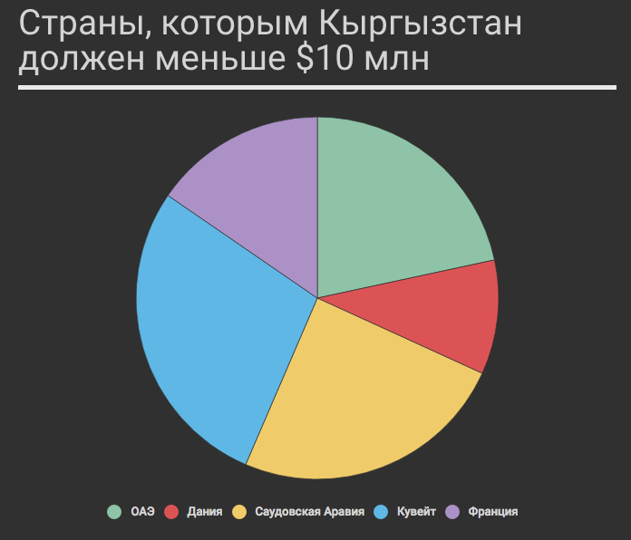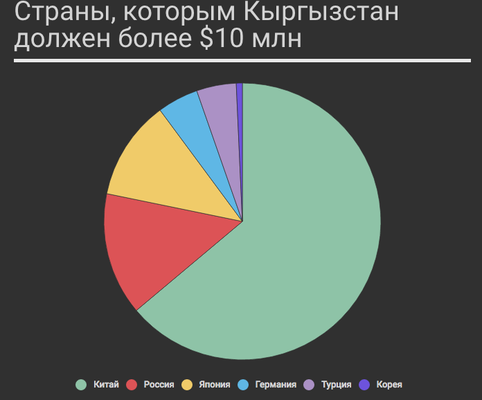 Все вышеперечисленное - гранты. Что же касается кредитов, их Кыргызстан набрал в разы больше. Последние открытые данные по государственному долгу страны свидетельствуют о том, что на начало текущего года республика должна более $3,6 млрд, $1,5 млрд из которых мы задолжали всевозможным международным организациям (Международный валютный фонд, Азиатский банк развития и так далее). Оставшаяся сумма в разрезе конкретных стран выглядит следующим образом.