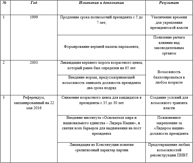 Основные изменения и дополнения, внесенные в Конституцию Таджикистана рассмотрены в таблице 1.