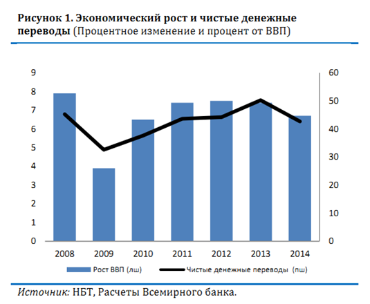 Согласно данным НБТ, после 19% роста в 2013 году, стоимость денежных переводов в долларовом выражении снизилась на 8,3% в 2014 году в годовом исчислении.