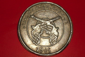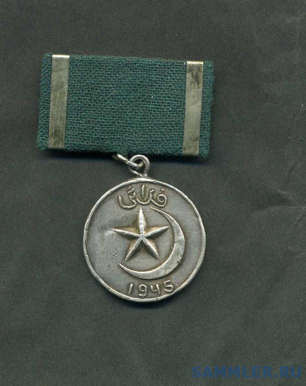 Еще одна медаль, также со звездой и полумесяцем на лицевой стороне, отличается от других тем, что дата "1945" помещена также здесь, причем она не выбита, а отлита вместе с медалью. Здесь же надпись - "доброволец" (фида и). Можно предположить, что медалью награждались первые воины - - добровольцы армии ВТР. Любопытно, что на оборотной стороне дата повторяется, но здесь она сделана штампом. Мне известны три такие медали: две - с датой на обороте "1945" (N 11 и 74) и одна - "1946" (N112).
