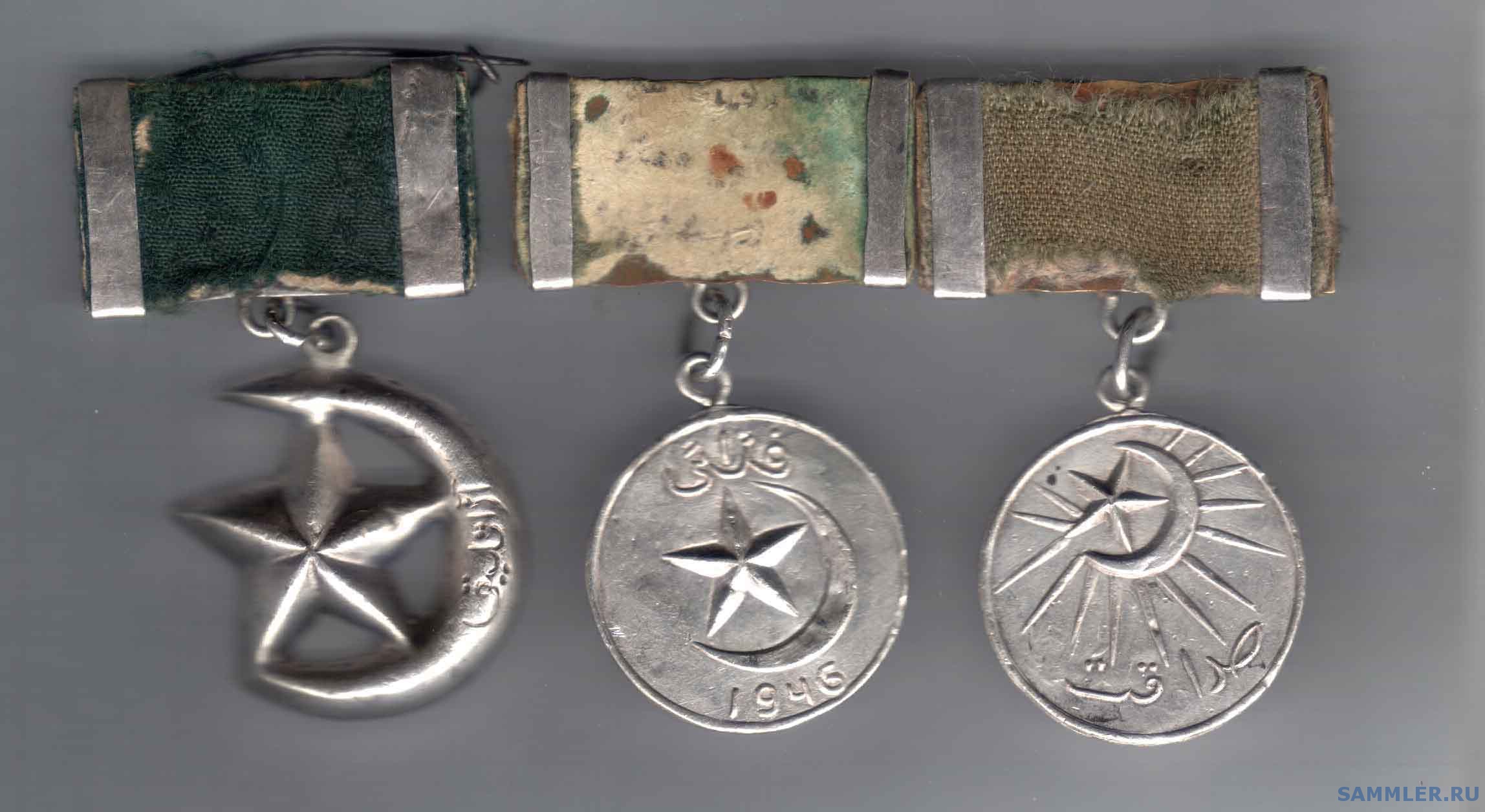 Третья медаль, надпись на которой можно перевести как "верность", "честность", "дружба" (садякет), отличается тем, что звезда и полумесяц расположены на ее лицевой стороне в левой верхней части, а от них по всему полю награды расходятся стилизованные солнечные лучи. Мне известны четыре экземпляра этой медали. Одна датирована 1945 годом (N 226), три - 1946-м (N 994, 1349 и 1632). Две последние медали - на планке зеленой материи.