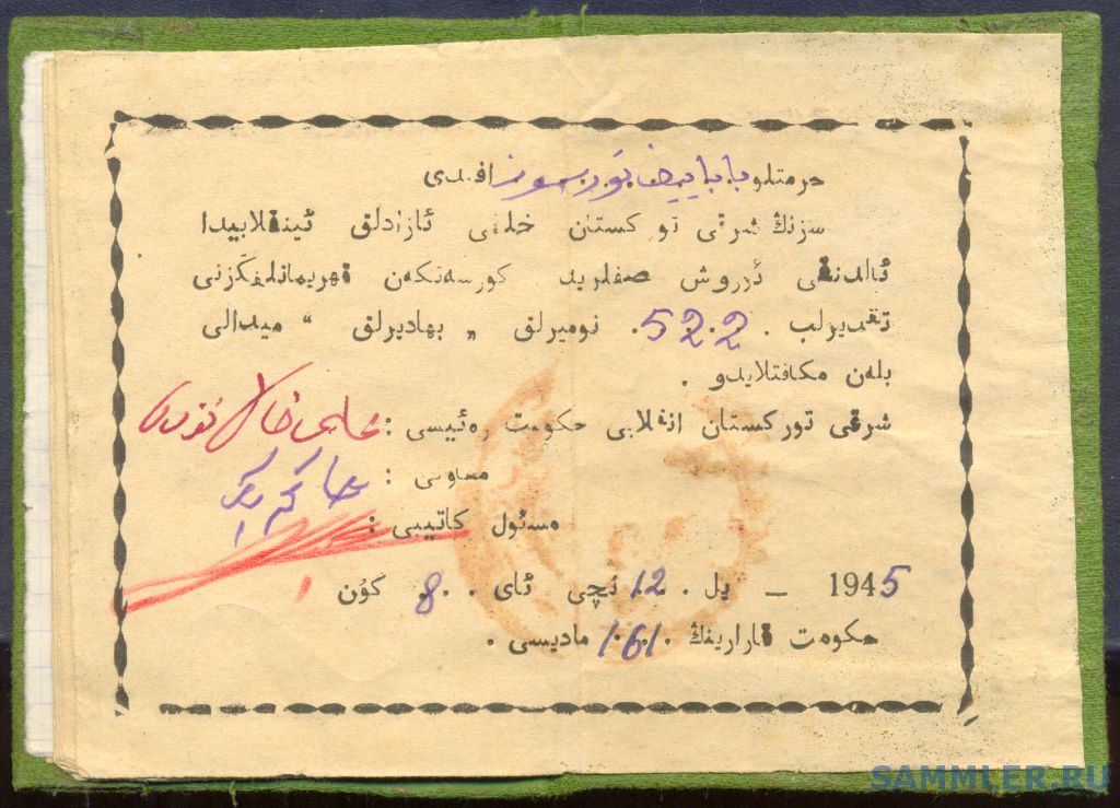 "Правительство ВТР, признавая Ваши выдающиеся заслуги в деле независимости ВТР, награждает Вас орденом "Борьба за независимость" 2 степени под номером 61". Далее идут подписи председателя правительства ВТР узбека Алихана Туре Шакирходжаева и его заместителя уйгура Хакимбека Ходжи.