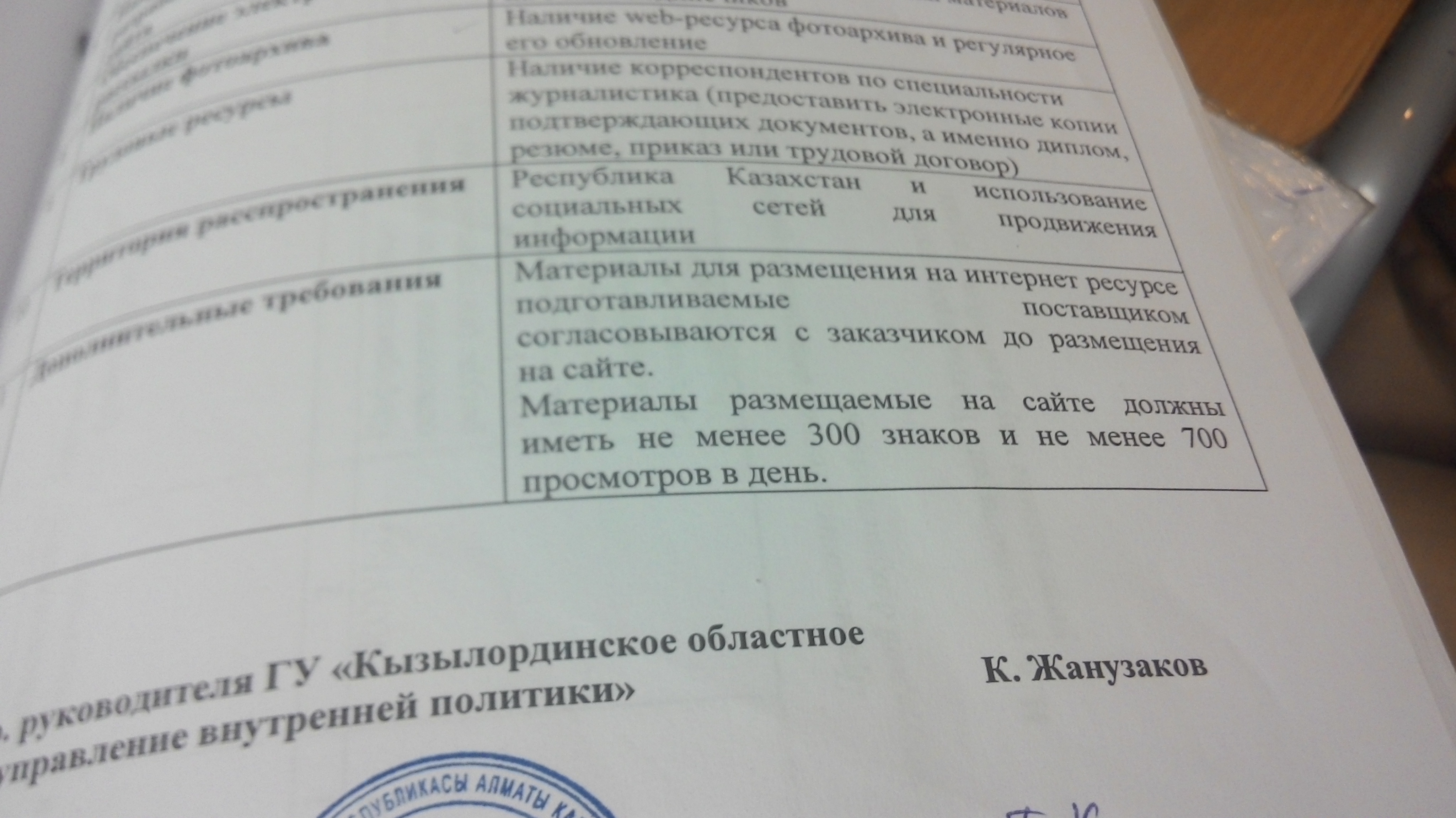 Конкурс же кызылординского управления внутренней политики закончился 29 апреля. И почти месяц (что подтверждается их же ответом) победителем считалось «Время бизнеса...». В таком виде тендерные документы и попадают в редакцию «Радиоточки». 24 мая другое СМИ – информагентство KazakhstanToday сообщает, что «в Кызылординской области государственный информационный заказ на сумму в 9,3 миллиона тенге осуществляет ресурс infotime.kz с посещаемостью 18-90 человек в сутки, что не соответствует технической спецификации закупаемых услуг». Эту информацию местное УВП не опровергает. А о том, что ещё 20 мая результаты их конкурса с 8 лотами были отменены решением органов финансового контроля, сообщает только сегодня с припиской: «Сведения, указанные в статье «Идеология страны в руках одного ИП», опубликованной на сайте «Радиоточка», не соответствуют действительности».