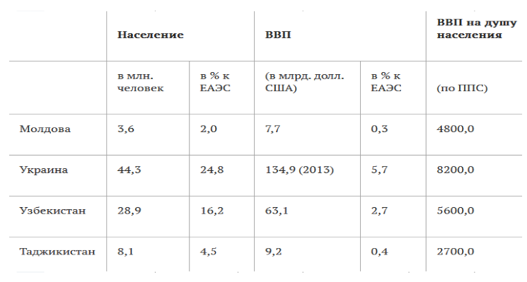 Таблица 1. Экономические показатели потенциальных членов ЕАЭС