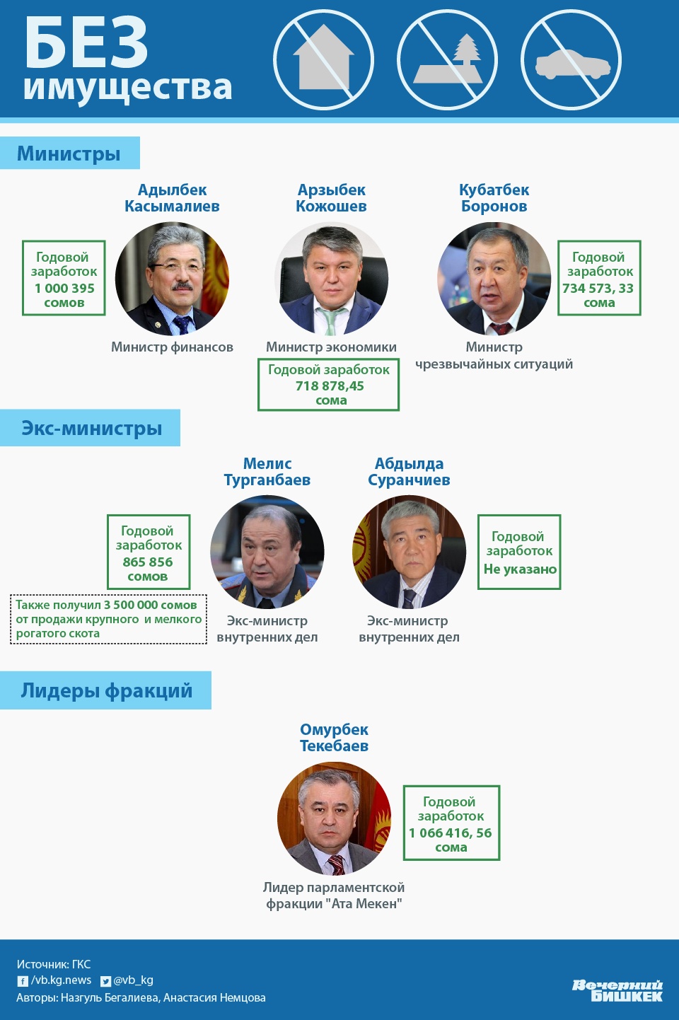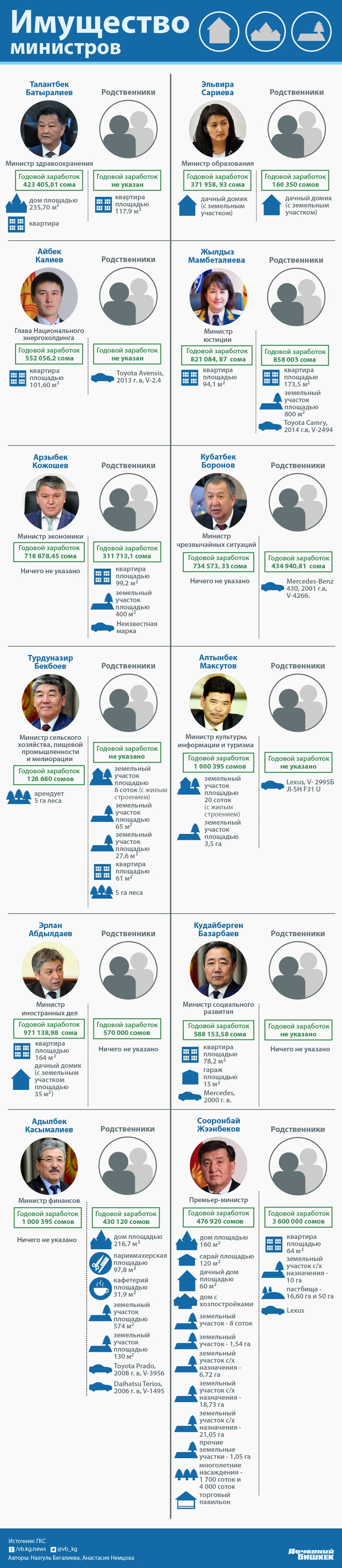 Главы трех ключевых министерств вообще оказались без имущества, в том числе главный налоговик Замирбек Осмонов. Про других чиновников понятно: они прятали свое имущество и таким образом опасались налоговой. Напрашивается вопрос: а Осмонову-то это зачем?