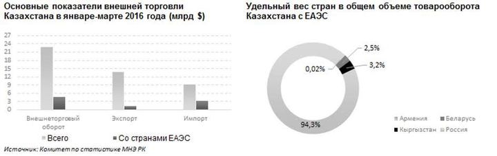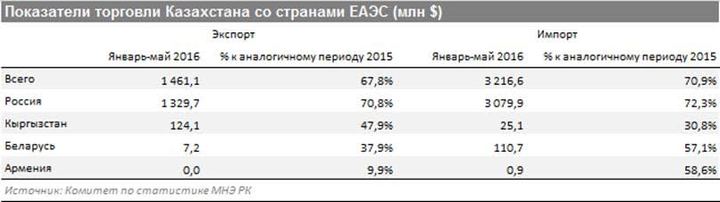 В период с января по май 2016 отмечается снижение на 30,1% товарооборота Казахстана в денежном выражении с участниками Евразийского экономического союза (ЕАЭС) – до $4,68 млрд.