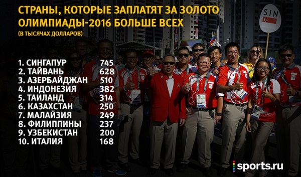 Лидером стал Сингапур, где правительство заплатит призерам 745 тысяч долларов США.