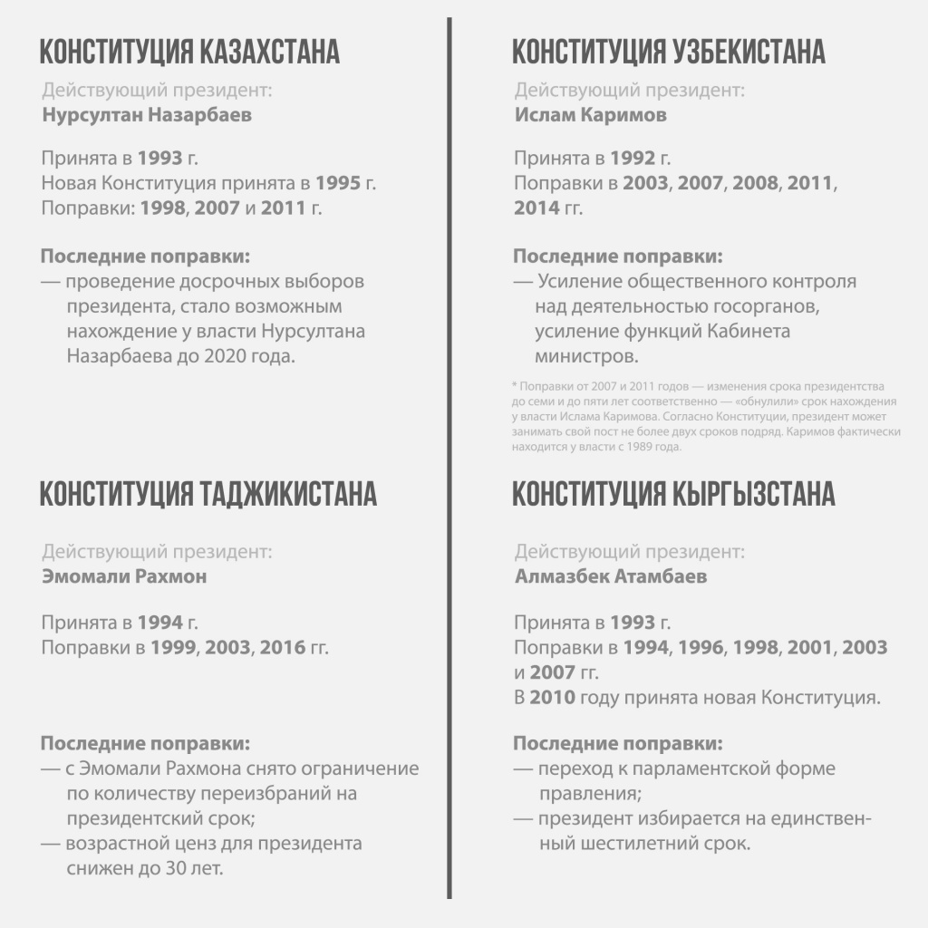 Парламент Кыргызстана предложил в очередной раз изменить Конституцию республики — сейчас законопроект об этом находится на общественном обсуждении. «Открытая Азия онлайн» посчитала, сколько раз и как менялись Конституции центральноазиатских стран, и как часто в них упоминаются основные понятия.