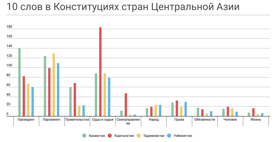 Пока изменения в основной закон Кыргызстана не внесены, если судить по словам, которые наиболее часто используются в Конституции, больше всего внимания уделяется судам, правосудию и полномочиям Жогорку Кенеша (парламент Кыргызстана, — прим. ОА). Интересно, что в Конституции Кыргызстана больше, чем в основных законах других стран Центральной Азии, говорится о самоуправлении. Сравнение основных понятий по разным странам - в нашей инфографике.
